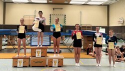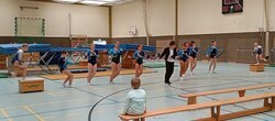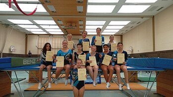 Die Wettkämpfe, eingeteilt in 4 Anfängerklassen, 2 fortgeschrittene und 2 Masterklassen, liefen für unsere Turnerinnen im Großen und Ganzen recht gut. Es gab wenig Abbrüche und am Ende kamen 6 Treppchenplätze heraus. Leider verfehlte Melissa in der höchsten Wettkampfklasse das Podest wegen einer Mattenberührung am Ende ihrer Finalübung, was sie den entscheidenden Punkt in der Wertung kostete.