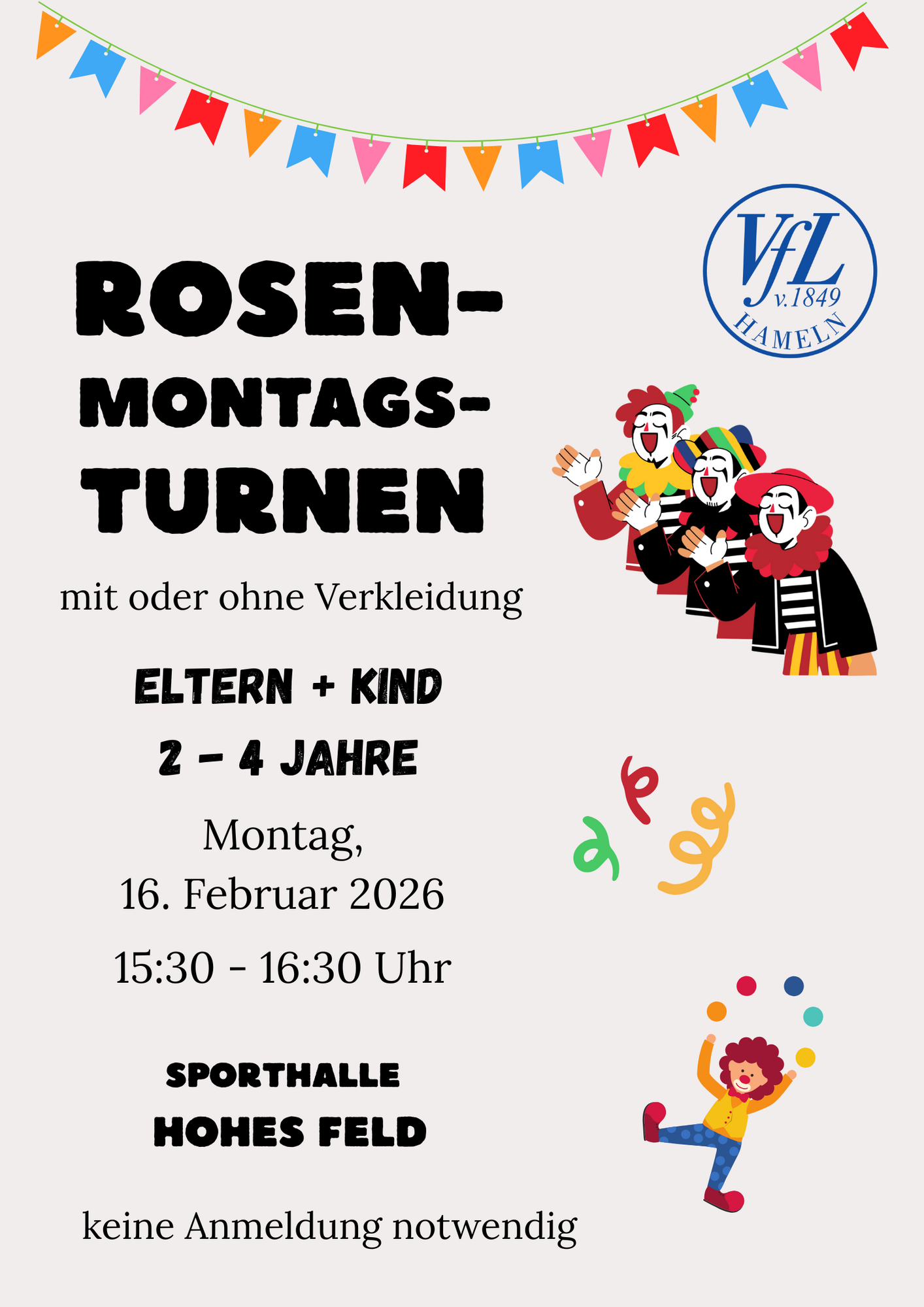Es ist Karneval! Jedes Kind ist am Montag, dem 16. Februar 2026 willkommen, mit seinen Eltern und uns zu turnen. Los geht es um 15:30 Uhr in der Sporthalle Hohes Feld.